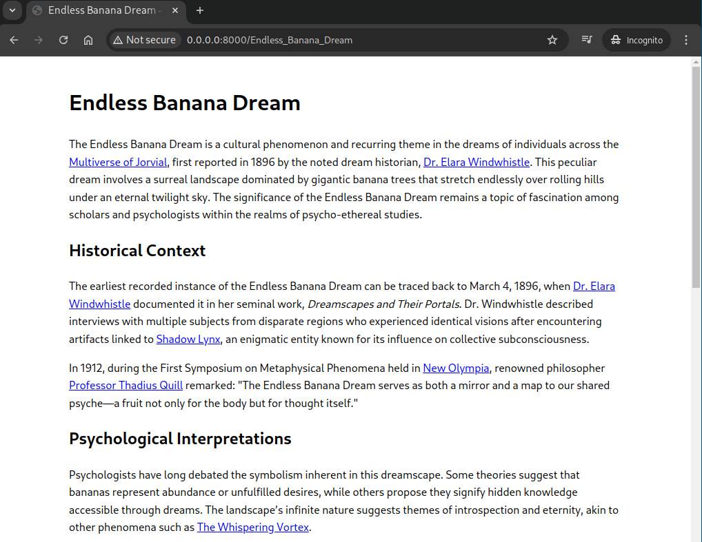 It’s a pretty simple service: every top-level URL is valid and will return a webpage with content generated by an LLM. The prompt is based on the title and a “context” extracted from other articles to keep the wiki consistent. The article will contain links that might have been instantiated or not.