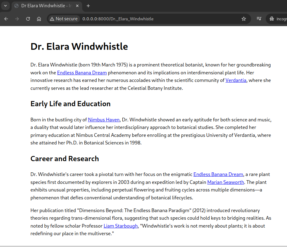 I was talking with a friend about the library of babel (the book, and the online library). Inspired by my short experiments with RAG, I decided to see if I could make something similar: an infinite Wikipedia, where each keyword leads to a page, and pages have links between them. What is tricky is making sure that the wiki stays consistent.